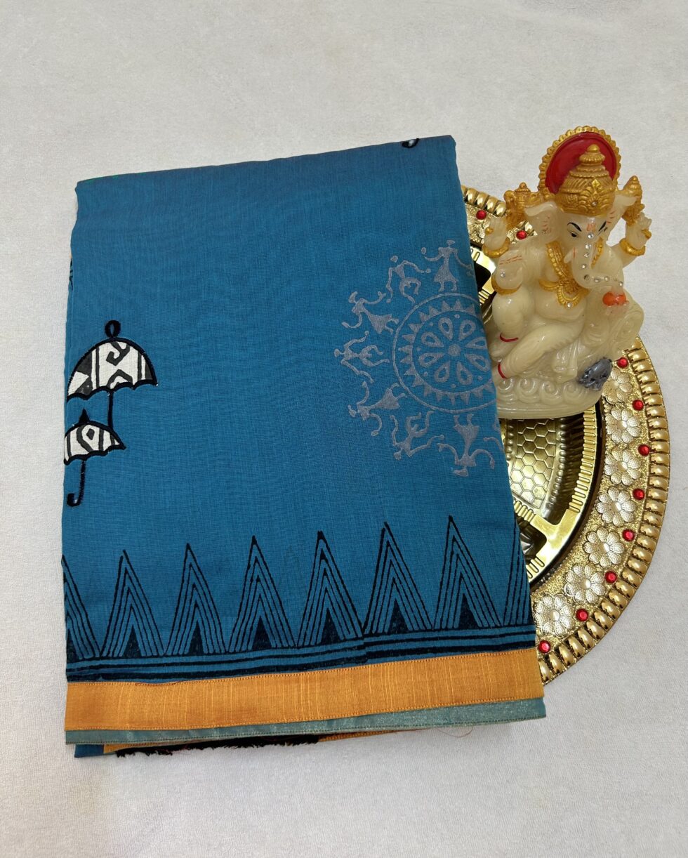 BLUE COLOUR – PURE CHANDERI COTTON SAREE WITH BLOUSE AND APPLIQUE WORK