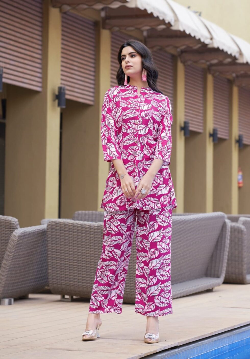 A co-ord set (short for coordinated set) refers to a matching outfit that typically consists of a top and bottom made from the same fabric or in a complementary style. These sets are designed to be worn together, offering a coordinated look without the effort of mixing and matching. Co-ord sets can be casual or formal and come in various styles, such as skirts and blouses, pants and shirts, or shorts and matching tops, making them versatile and stylish choices for various occasions.