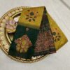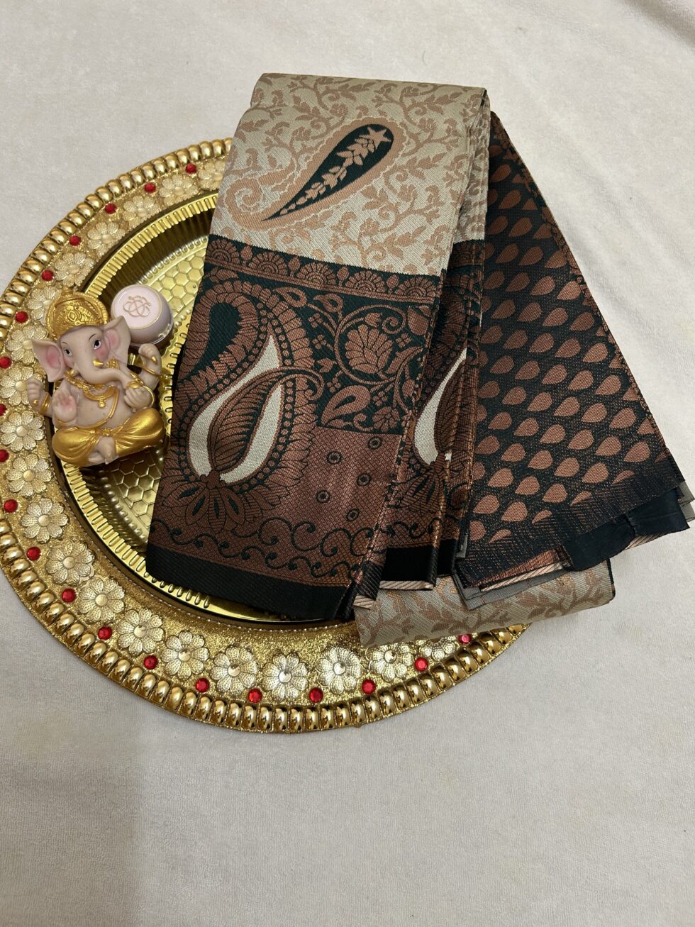 Subtle cream tones paired with rich copper accents create a timeless statement. This saree exudes understated elegance, perfect for graceful evenings and special occasions.”
