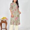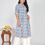 A kurti is a traditional South Asian garment, typically worn by women. It is a tunic-style top that can vary in length, from hip-length to knee-length or even longer. Kurtis are often made from cotton, silk, or other fabrics and are adorned with different styles, embroidery, and patterns. They are usually paired with leggings, jeans, or salwars for a complete outfit and can be worn casually or for more formal occasions. Kurtis are popular for their comfort and versatility.