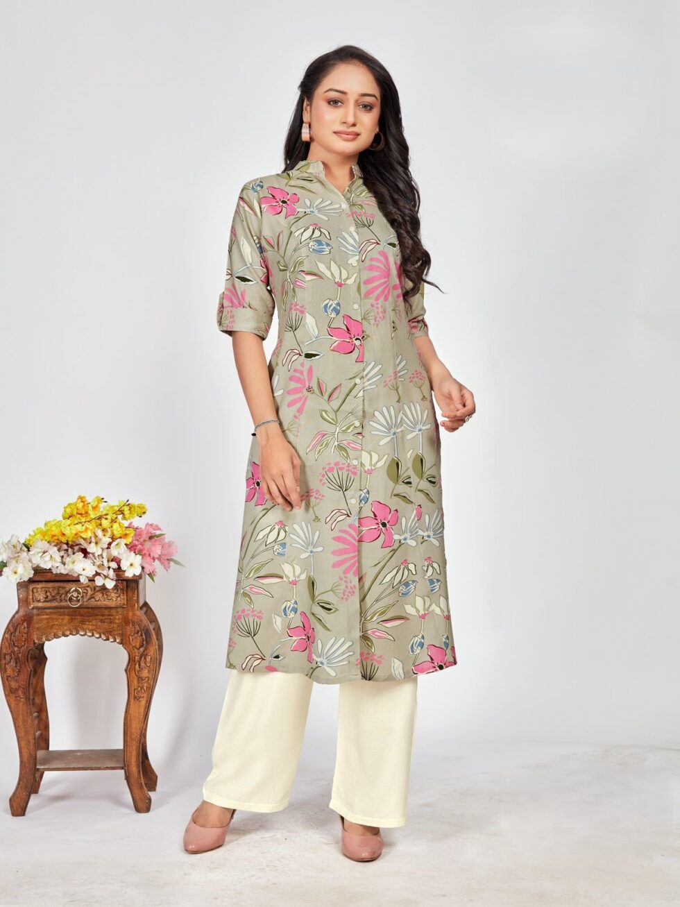 A kurti is a traditional South Asian garment, typically worn by women. It is a tunic-style top that can vary in length, from hip-length to knee-length or even longer. Kurtis are often made from cotton, silk, or other fabrics and are adorned with different styles, embroidery, and patterns. They are usually paired with leggings, jeans, or salwars for a complete outfit and can be worn casually or for more formal occasions. Kurtis are popular for their comfort and versatility.